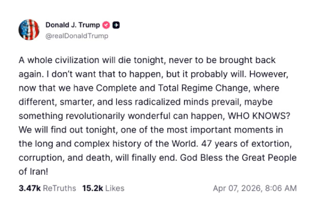 复活节后的星期二,他发出了其总统任期内最戏剧性的最后通牒,称除非伊朗在12小时内达成协议,否则“整个文明将会灭亡”。