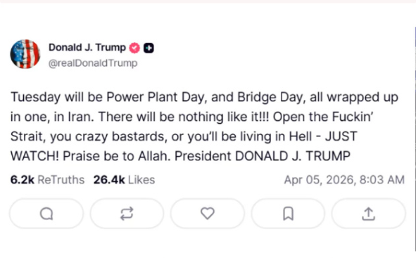 复活节(4月5日)清晨,他在白宫官邸通过社交媒体怒斥伊朗,他在社交媒体上这样说:“要么打开他妈的霍尔木兹海峡,你们这些疯子,要么就等着下地狱吧!”