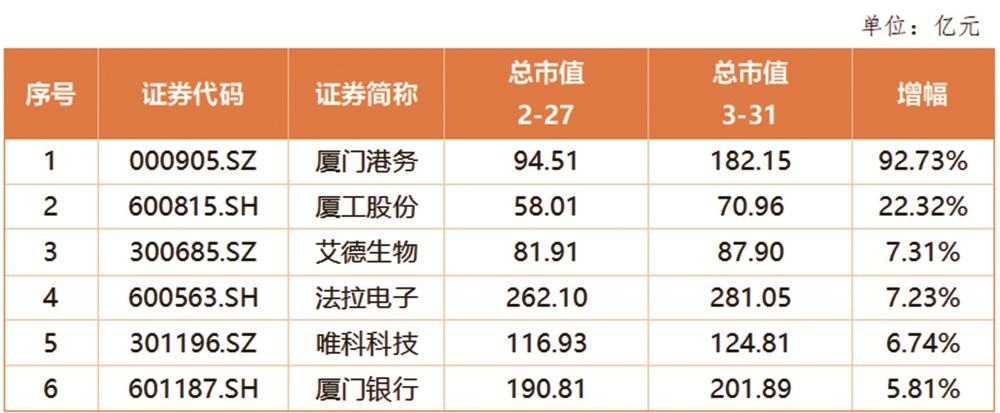 ▲截至2026年3月底,厦门共有10家A股上市公司市值对比2月有所增长,6家公司市值涨幅超5%。