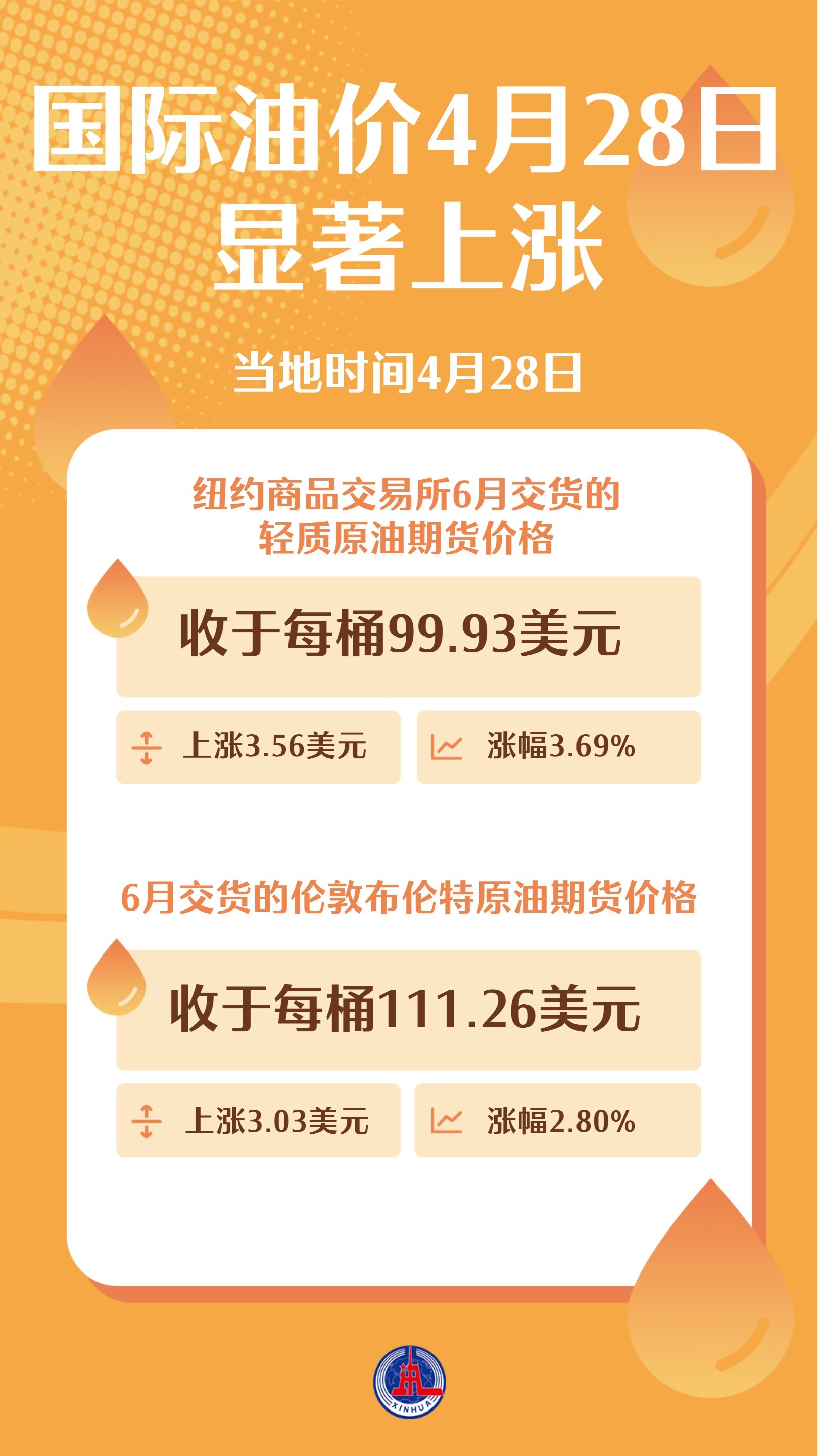 截至当地时间4月28日收盘,纽约商品交易所6月交货的轻质原油期货价格上涨3.56美元,收于每桶99.93美元,涨幅为3.69%;6月交货的伦敦布伦特原油期货价格上涨3.03美元,收于每桶111.26美元,涨幅为2.80%。