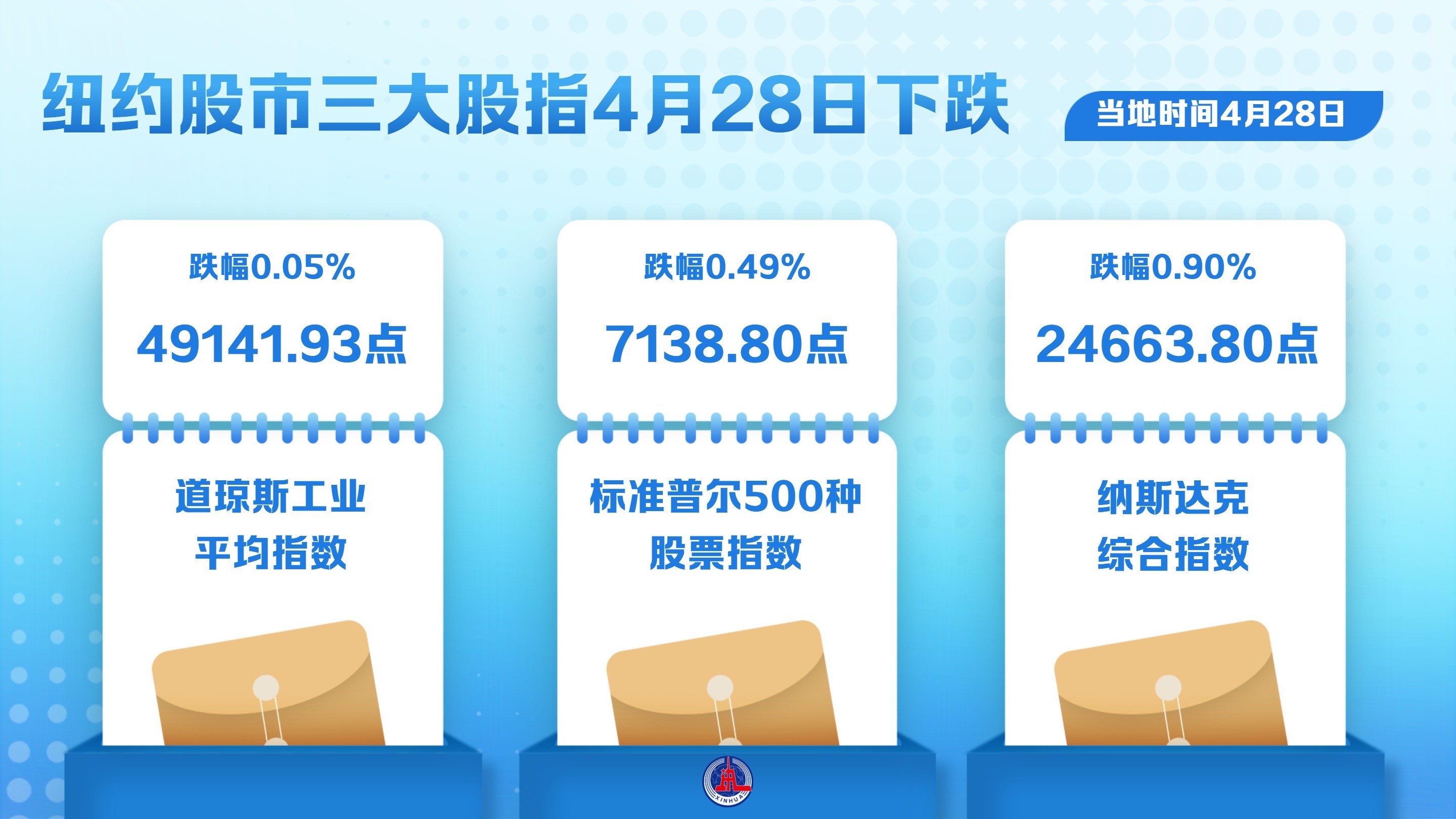 截至当地时间4月28日收盘,道琼斯工业平均指数比前一交易日下跌25.86点,收于49141.93点,跌幅为0.05%;标准普尔500种股票指数下跌35.11点,收于7138.80点,跌幅为0.49%;纳斯达克综合指数下跌223.30点,收于24663.80点,跌幅为0.90%。