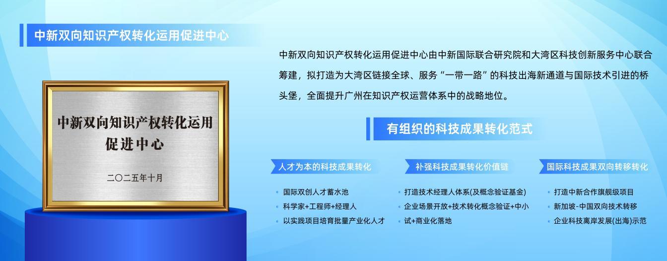 10月31日,第七届粤港澳大湾区知识产权交易博览会在广州中新广州知识城国际会展中心开幕。在当天的“知产强链·出海共赢——知识产权护航出海”专题活动现场,“中新双向知识产权转化运用促进中心”(以下简称“双向中心”)正式揭牌。中新国际联合研究院副院长顾海文与大湾区科技创新服务中心董事长秦海鸥共同揭牌,世界知识产权组织中国办事处高级顾问白光清、广州市市场监督管理局(知识产权局)副局长万众、广州开发区知识产权局局长钟梓坚、新加坡知识产权局国际事务机构助理司长许慧如见证,彰显了中新双边对知识产权跨境转化的高度重视与支持。